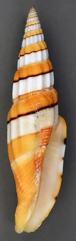 The shell is elongately fusiform. The spire is turreted and sharply produced. The whorls are angulated at the upper part, longitudinally ribbed, transversely elevately striated. The shell is alternately zoned with orange-red and blueish white, edged with black. The columella is four-plaited.[2]