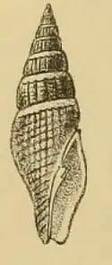A small, turreted, fusiform and light-coloured species, with rather flat whorls, undulating axial ribs and clathrated interstices. The whorls are sprinkled with red spots. The aperture is narrow at the top. The base of the shell is slightly recurved. The columella is four-plaited. [2]