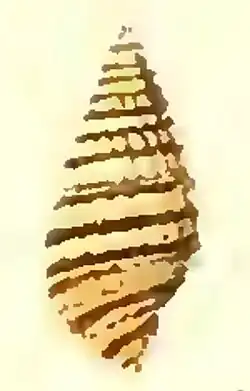 (Original description) The shell is ovate with an acuminated spire. The whorls are convex and longitudinally granosely ribbed. The shell is bright yellow, encircled with two or three narrow dark chesnut zones. The columella is four-plaited.[2]