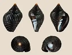 The color of the shell is dark chocolate-brown, the aperture and the columella are white or slightly tinged with light chocolate.[2]