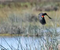 A Red-Winged Blackbird in flight at the Vic Fazio Wildlife Area.