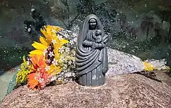 According to tradition, la negrita is a small (about 3 inches (7.6 cm)), probably indigenous or mixed race, representation of the Virgin Mary found on 2 August 1635 by a native woman named Juana Pereira. As the story goes, when she tried to take the statuette with her, it miraculously reappeared twice back where she had found it. The townspeople then built a shrine around the statue.[2]