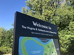 The park is situated within a floodplain west of the Indianapolis Museum of Art and Oldfields, bordered on the east by the Indiana Central Canal and on the north and west by a meander in the White River.[3] The park was intentionally developed to emphasize surrounding natural features, including woods, meadows, wetlands, and a 30-to-40-acre (12 to 16 ha) quarry lake.[4][3][5] Virginia B. Fairbanks, the wife of benefactor Richard M. Fairbanks, is the park's namesake.[1]