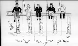 When she was 13, de Carvalho received recognition from an organization that promoted drawing in schools. She and two other students in the Convent of the Sacred Heart received prizes for work they had submitted to the annual exhibition held by the Royal Drawing Society in London.[8] She became a member of a local group called the Chinese Caricaturist Club, and in 1933 contributed a political cartoon to an American-owned English-language newspaper called the Shanghai Evening Post & Mercury.[3][9] The cartoon showed personifications of Japan, France, Britain, and the USSR angling in Far Eastern waters for fish labeled as Manchuria and other large sections of Chinese territory. Seated next to them, Uncle Sam throws back a fish labeled Philippines.[10]