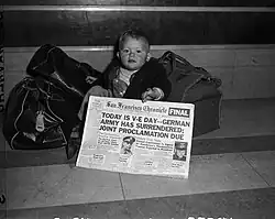 Virginia de Carvalho, Baby Holding a Newspaper Announcing Victory in Europe, May 8, 1945