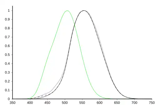 Photopic (black) and scotopic (green) luminous efficiency functions. The horizontal axis is wavelength in nm. See luminous efficiency function for more info.