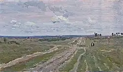Vladimirka and four other Levitan works were exhibited at the Society for Travelling Art Exhibitions' twenty-first exhibition, which debuted in Saint Petersburg in February 1893 before moving to Moscow in March.[13][14] The landscape paintings in the exhibition received very little attention from Saint Petersburg critics; the only mention of Vladimirka was in the 47th issue of the Peterburgskaya Gazeta on 18 February 1893, where it was noted that Vladimirka had "the most unattractive 'grey' motives" and the author remarked, "What could be more boring than 'Vladimirka' by Levitan?"[15] More reviews of the painting appeared in the press after the exhibition was relocated to Moscow, the majority of which were complimentary; in particular, Vladimir Sizov (Russkiye Vedomosti), Vladimir Gringmut (Moskovskiye Vedomosti), and Mikhail Korelin (Russkaya mysl) all praised the work.[16]