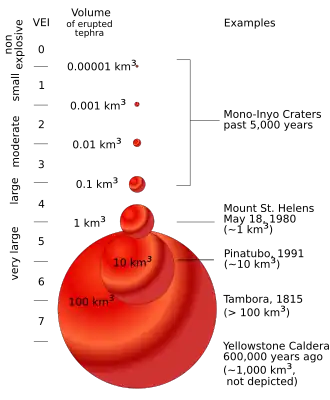 | 6 | >25 km (16 mi) | 10 km3 (2 cu mi) | Plinian/Ultra-Plinian | 50–100 years | Mount Pinatubo (1991) |