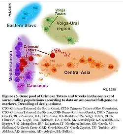 - ^ Balanovska, E. V.; Agdzhoyan, Anastasiya; Zhabagin, Maxat; Yusupov, Yu. M.; Skhalyakho, Rosa; Dolinina, D. O.; Padyukova, A. D.; Kuznetsova, M A.; Markina, N. V.; Atramentova, Lubov; Lavryashina, Marya; Balanovsky, O. P. "The Tatars of Eurasia: peculiarity of Crimean, Volga and Siberian Tatar gene pools". Moscow University Anthropology Bulletin. 3: 75–85.