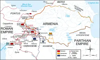 This situation was important and endangered the relations between Vologases and his subjects.[17] During a public feast, Vologases supported Tiridates' appeals, and placed the royal diadem on his head.[13] He also appointed a certain nobleman named Monaeses as the commander of a Parthian force that included contingents from Adiabene.[18] Monaeses was sent into Armenia, where he besieged Tigranocerta in 62.[15][16] The city was strongly fortified, and had been further reinforced by two legions. The Parthians attempts to scale the city proved fruitless, with the Adiabenian contingents suffering heavy losses.[15]