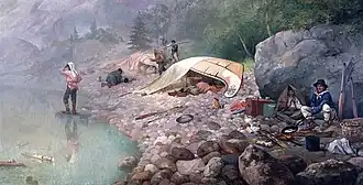 Three major influences molded the lives of voyageurs. First, their background of French-Canadian heritage as farmers featured prominently in their jobs as voyageurs. Working as a voyageur was seen as a temporary means of earning additional income to support their families and expand their farms.[17] Most voyageurs were born in New France. However, fur trading was not an everyday experience for most of the colonial population. Roughly two thirds of the population did not have any involvement in the fur trade.[18] The second influence came from indigenous communities. Voyageurs learned from indigenous people how to survive in the regions they travelled and adopted many traditional methods and technologies. Voyageurs also brought Western materials and techniques that were valued by the communities they encountered.[19] The final influence was the social structure of the voyageurs life. Since this group was limited to men , it was highly masculine. These men engaged in activities such as gambling, drinking, fighting; interests which were reserved for men of this trade.[19]