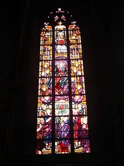 • There are stained-glass windows by Józef Mehoffer (1938) in the presbytery window, of which the middle window shows the Assumption of the Virgin Mary