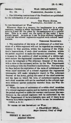 - ^ a b c Lefferts, Peter M. (Fall 2013). "U.S. Army Black Regimental Bands And The Appointments Of Their First Black Bandmasters". Black Music Research Journal. 33 (2): 151–175. doi:10.5406/blacmusiresej.33.2.0151. S2CID 191497925. ProQuest 1514682791.
