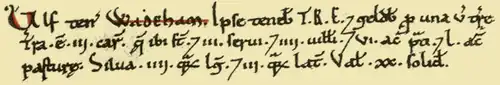 Ulf ten(et) WADEHAM. Ipse teneb(at) T(empore) E(dwardi) R(egis). Geld(a)b(at) p(ro) una v(irgata) t(er)rae. T(er)ra e(st) III car(rucis) q(uae) ibi s(un)t. III servi, IIII vill(an)i, VI ac(rae) pti L ac(rae) pasturae, silva IIII l(on)g(a) III lat(a). Valet XX solidii ("Ulf holds Wadham. He himself held it in the time of King Edward (the Confessor). It paid tax for 1 virgate of land. Land for 3 ploughs which are there. 3 slaves, 4 villagers, 6 acres of ..., 50 acres of pasture, wood 4 furlongs long, 3 furlongs wide. It is worth 20 shillings).