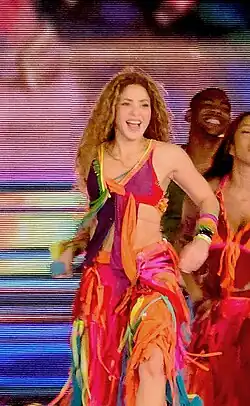 The song was performed for a second time by Shakira and Freshlyground at the 2010 FIFA World Cup closing ceremony on 11 July 2010.[88] Shakira's costume was designed by Cavalli again and consisted of a tulle top, a silk-fringed skirt with floral motifs and a denim belt. The top and belt were embroidered with pearls of various colours. Shakira also wore leather bracelets embellished with floral silk decorations.[89] Billboard critic Coetzer wrote that the performance of the song "sparked an ecstatic response" from the spectators.[88] Siddharth Saxena from Times of India described the presentation as a "riot of colour, light and laser show".[90]