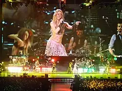 Shakira performing "Waka Waka (This Time for Africa)" during The Sun Comes Out World Tour in Madrid, Spain. The song peaked at number one in Spain for 17 consecutive weeks.[12]