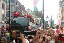 Wales lost 2–0 in the semi-final against Portugal with goals from Cristiano Ronaldo and Nani early in the second half.[46] Wales were welcomed back home on 8 July with an open-top bus parade around Cardiff, starting at Cardiff Castle and going past the Millennium Stadium before finishing at the Cardiff City Stadium.[47]