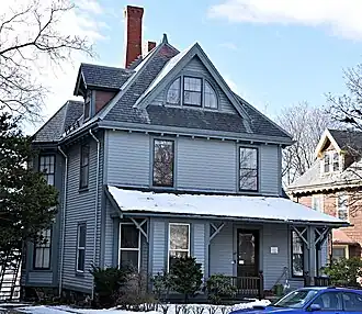 The Barnes House stands in central Somerville, on the south side of Highland Avenue (a major east–west route through the city) between Central Street and Trull Lane. It is a 2+12-story wood-frame structure, with a hip roof and clapboarded exterior. The roof faces each have dormers, the one in front extended in width to a triangular shaped, and nearly filled by a half-round window. The main roof eaves are bracketed, and there are Stick-style braces on the square posts supporting the front porch. The porch has a shed roof, and wraps around to the right side to a projecting section.[2]