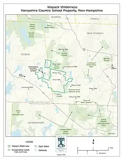 The Wapack Wilderness is a 1,400-acre (6 km2) tract of forest in the towns of Rindge and New Ipswich, New Hampshire. The land is owned by the Hampshire Country School, a small, private school for students who do not thrive in traditional settings. It abuts Binney Pond Natural Area and land conserved by the New England Forestry Foundation.[1] Watatic Mountain Wildlife Area[2] is two miles (3 km) to the southeast, and Annett State Forest[3] is two miles (3 km) to the northeast. The headwaters of the Millers River flow from the area, feeding into Converse Meadows and Lake Monomonac before entering Massachusetts.[4]