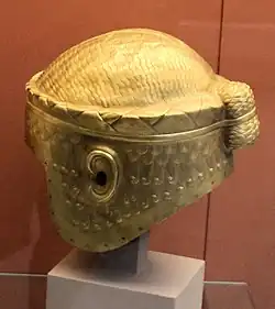 Soldiers in ancient Mesopotamia militaries were well-trained and well-equipped. Archaeological studies show that the Sumerians used war-carts and iron or bronze weapons;[1] most soldiers used axes, daggers, and spears; units with spears would be organized into close-order formations.[2] Armor included copper and bronze helmets, as well as bronze armor and cloaks studded in metal discs, although some depictions of light infantry show them without armor, only wearing skirts adorned with feathers. The oldest known helmet ever, the Golden Wig, was made of beaten and engraved gold with a wadded linen liner. Bronze and copper alloy helmets dating back to 2500 BCE have also been found. By 2100 BCE, bronze scale armor had developed.[3]