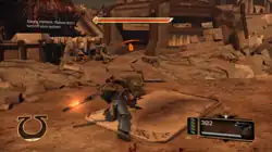 In Space Marine, the player engages enemies in both melee and at range from a third-person point of view.[4] The player character, Demetrian Titus, has a regenerative force shield (i.e. the "Iron Halo") that can absorb initial damages but require certain cooldown before recovery.[5] When his health gets low, performing stun moves can allow Titus to trigger a quick time event known as "Execution" which results in an instant kill and regaining a portion of his health.[6] Titus is accompanied by the characters Sidonus and Leandros for most of the game, though some missions are performed alone.[7] The game features a "Fury" meter that, when filled up, grants rapid health regeneration and stronger melee attacks.[5] This ability can later be upgraded with purity seals to improve its duration, the rate at which it recharges, and the effectiveness of ranged attacks (slow motion when zoomed, a faster fire rate and increased damage).[5]