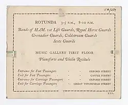 A new Waring & Gillow building was opened in 1906 on Oxford Street and signalled a true integration of both companies.[9] The inauguration event took place from 11 to 16 June 1906. The Brotherton Library Special Collections archive at Leeds University houses the John Evan Bedford Library of Furniture History. This collection, collected by antiques dealer John Bedford, contains a ticket from the inaugural Waring & Gillow event (below right). The ticket shows that there had been music and entertainment during the evening as well as demonstrating the general grandeur of the affair, with separate entrances for guests using carriages.[13]