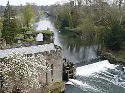 In 1788 the Earl of Warwick obtained an Act of Parliament to enable him to build a new bridge over the Avon: Castle Bridge, which consists of a single sandstone arch was opened in 1793.[32] It replaced an older 14th century bridge further downstream, known as Old Castle Bridge, which fell into ruin, although remains of it can still be seen.[33] The Warwick and Birmingham and Warwick and Napton canals were both opened through Warwick in 1800. They now form parts of the Grand Union Canal.[34]