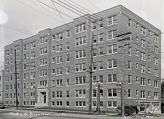 The Washington Apartments were constructed in 1922 to house factory workers from the nearby Reo Motor Car Company Plant. It was one of the largest residential apartment buildings constructed in Lansing during this period in the early 20th century.[2] The building was funded by developer Lewis F. Breitenwischer, who had previously constructed apartment buildings in the area. Breitenwischer commissioned local architect Judson N. Churchill to design the building and hired Reniger Construction Company to build it. Construction began in ate 1922 and the apartment building was completed in 1923.[3]