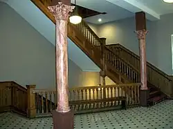 The courthouse contains three stories and a basement, a grand staircase, and hydraulic elevator. The basement (first floor) housed the offices promised to the City of Fayetteville, including the mayor. The second floor housed court clerks, the county judge, a vault, and three outdoor porches. The third floor housed a large courtroom with a slanted floor, jury rooms, judge chambers, and a porch. The fourth floor contained a balcony over the courtroom and access to the clock/bell tower. The courthouse features round-top arches over its windows, porches, and grand entrance, round towers with conical roofs, and brickwork, each characteristic of Richardsonian Romanesque architecture.[6] Inside, the building contains glazed brick fireplaces in all offices, and ceramic mosaic floor tiles in all foyers and corridors. There is a mural dedicated to those Washington County persons who died in World War I, completed in 1920 by William Steene. The building also contains the Freedom Shrine, housing replicas of many important freedom documents such as the Mayflower Compact and the Declaration of Independence.[7]