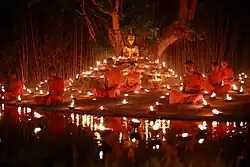 At the rear of the temple is a bell-shaped pagoda surrounded by smaller pagodas. The temple is a focal point for celebrations during the Visakha Bucha festival when monks light hundreds of small butter lamps and place them on the water and around the grounds, and during the Loy Krathong festival .[1][7]