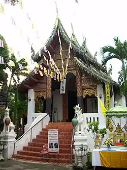 The temple includes an assembly hall, ordination hall and two chedis constructed in the Lan Na style. The assembly hall, built around 1910 in the Lan Na style, contains modern murals of the Vessantara Jataka typical of the Rattanakosin style. The principal Buddha image (Phra Phuttha Patimokorn) dates from the same period. The small ordination hall is guarded by a pair mythical beasts called mom, regarded as some of the finest examples of naga-makara art in Lan Na, and includes finely carved wooden doors and windows, and murals featuring scenes from the life of the Buddha.[4] The older of the two chedis known as the Umong Chedi, and built around 1840 in the La Na style, has an underground chamber used by monks for peaceful meditation.[1][2][3][5]
