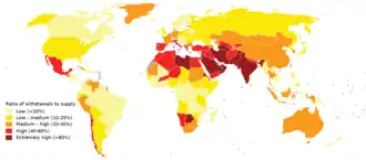 Water risk refers to the possibility of problems to do with water. Examples are water scarcity, water stress, flooding, infrastructure decay and drought.[18]: 4 There exists an inverse relationship between water risk and water security. This means as water risk increases, water security decreases. Water risk is complex and multilayered. It includes risks flooding and drought. These can lead to infrastructure failure and worsen hunger.[19] When these disasters take place, they result in water scarcity or other problems. The potential economic effects of water risk are important to note. Water risks threaten entire industries. Examples are the food and beverage sector, agriculture, oil and gas and utilities. Agriculture uses 69% of total freshwater in the world. So this industry is very vulnerable to water stress.[20]