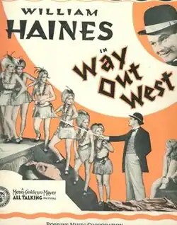 Way Out West is a 1930 American pre-Code parody film, directed by Fred Niblo, starring William Haines, Leila Hyams, Polly Moran, and Ralph Bushman. It tells the story of Windy, a con man who cheats a group of cowboys out of their money. When they discover his cheating and learn that he has been robbed, they force him to work on a ranch until he has paid his debt.