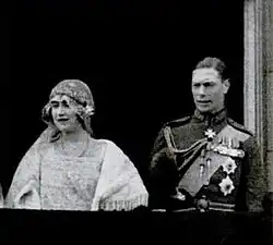 In February 1922, Elizabeth was a bridesmaid at the wedding of Albert's sister, Princess Mary, to Viscount Lascelles.[5] The following month, Albert proposed again, but she refused him once more.[6] Eventually, on 13 January 1923, Elizabeth agreed to marry Albert, despite her misgivings about royal life.[7] Following the engagement, she gave an interview to the press. She appeared to be relaxed and laughing and referred to Albert by his nickname "Bertie", which made the King furious in private.[1]