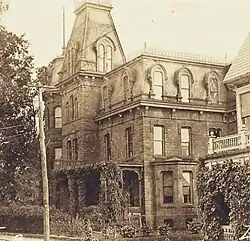 Weigley Mansion (Heidelberg Hall) is a classic example of Gilded Age exuberance as it includes design features such as two front towers, detailed chestnut wood moldings, thick solid paneled chestnut interior doors, a projecting second-story open porch, ornamental cast iron roof crests, three large formal entrance ways, high decorative plaster ceilings, several ornate chandeliers, a grand main staircase and nine fireplaces.[3][4][5]