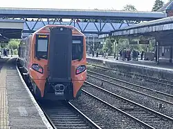 As of December 2023, Wellington is currently served by two trains per hour off-peak each way between Birmingham New Street and Shrewsbury, one operated by West Midlands Railway and the other by Transport for Wales. Transport for Wales' service operates to/from Birmingham International and runs limited stop, whilst the West Midlands railway services serves local stations.[9] TfW Rail trains continue beyond Shrewsbury alternately either to Aberystwyth and Pwllheli (combined portion service) or to Holyhead via Chester and Llandudno Junction. There are also two services to Llandudno (one on weekends) and one to Manchester Piccadilly, via Warrington Bank Quay on weekday evenings. On Sundays, hourly services are provided by Transport for Wales and West Midlands Railway.