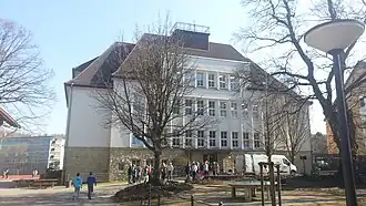 For students, there are three different outside areas: The school yard with its sports facilities such as a basketball basket, beach volleyball and football field, the 'Kastanienhof' with table tennis, and the 'Brunnenhof' with a fountain which can only be used by students in the last two years. Spread across the entire school grounds there are various art installations that were designed by different generations of students.