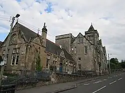 The original stone buildings have been B-listed since 1993.[3][4] When first constructed, West Coats Road did not extend south past Brownside Road, but contemporaneous with a southern extension of West Coats Road the three-storey extension was added on that side of the school; it is portrayed on the 1910 map of the area but not the 1896 version. Similarly, the railway line (Glasgow to Newton) in a deep cutting that bounds the school site to the south did not appear until that map edition.
