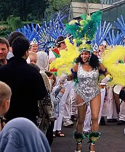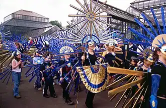 It has since become the biggest festival in Glasgow's calendar [1] with events running for 16 days in June. It has been used as a model for other festival start-ups, as with minimal local authority or Scottish Arts Council funding, and has grown with each festival. Its centrepiece carnival parade is the largest carnival event in the UK after Notting Hill in London. In 2006 the parade day ran congruently with the Glasgow Mela; organisers billed it as "Scotland's Mardi Gras" and an estimated 100,000 people took to the streets and parks.[2].