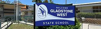 Gladstone West State School is a government primary (Prep-6) school for boys and girls at Boles Street (23°51′35″S 151°15′09″E / 23.8597°S 151.2525°E / -23.8597; 151.2525 (Gladstone West State School)).[17][18] In 2018, the school had an enrolment of 641 students with 45 teachers (43 full-time equivalent) and 35 non-teaching staff (23 full-time equivalent).[19] It includes a special education program.[17]