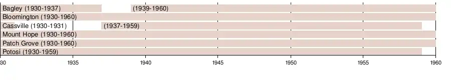 The West Grant League was formed in 1930[1] by six small high schools in western Grant County: Bagley, Bloomington, Cassville, Mount Hope, Patch Grove and Potosi.[2] Cassville left the conference after its first season[3] and rejoined in 1937.[4] They replaced Bagley, who exited the West Grant League that same year and reentered in 1939.[5] Stability among members was maintained for two decades before Cassville and Potosi left to join the Black Hawk League in 1959.[6] The conference continued on for one more season before rural school district consolidation made its continued existence impossible. In 1960, three of the four remaining conference members (Bagley, Mount Hope and Patch Grove) merged to form West Grant High School in Patch Grove,[7] and the new school competed independently for a year before joining the Southwest Wisconsin Athletic League in 1961.[8] Bloomington joined former rivals Cassville and Potosi in the Black Hawk League immediately after the dissolution of the West Grant League.[9]