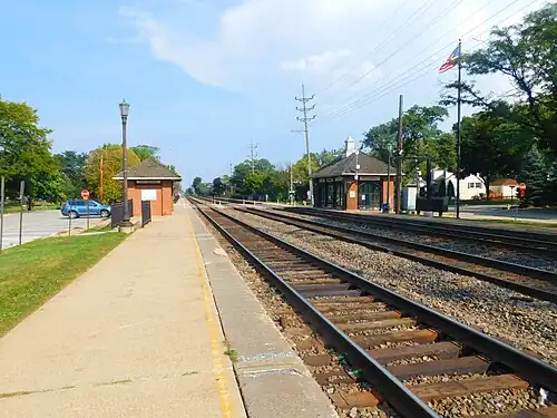 West Hinsdale is one of three stations on Metra's BNSF Line in Hinsdale, Illinois. The station is 17.8 miles (28.6 km) from Union Station, the eastern terminus of the line.[2] It is closed on weekends and holidays. In Metra's zone-based fare system, West Hinsdale is in zone 3. As of 2018, West Hinsdale is the 143rd busiest of Metra's 236 non-downtown stations, with an average of 306 weekday boardings.[1] There is an unstaffed weather shelter used only during rush hour. The station is immediately adjacent to Stough Park in Hinsdale and is located 0.5 miles from downtown Clarendon Hills, Illinois.