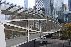 The original incarnation of the Liberty Street Bridge (40°42′38″N 74°0′53″W / 40.71056°N 74.01472°W / 40.71056; -74.01472), was called the South Bridge, as it was seen as a companion to its Vesey Street counterpart and had a similar design. Due to the attacks, it had sustained significant damage. However, unlike its counterpart, it was extended and repaired and was reopened in April 2002.[16] Since then, the bridge has been revamped and rerouted, due to its location near the World Trade Center site and the construction activity for the Vehicle Security Center and the demolition of the Deutsche Bank Building at 130 Liberty Street. On April 21, 2010, the eastern bridge access point was shifted onto the east side of West Street, from Liberty Street. A pre-fabricated segment was attached to the existing bridge, for use while construction proceeds on both sides along Liberty Street. The new pre-fabricated southward extension was fitted with an elevator for ADA accessibility.[17] The bridge was connected to Liberty Park at its eastern end in 2016.[18]