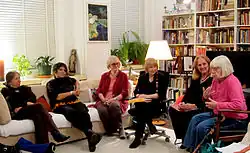 Westbeth Playwrights Feminist Collective at videtoped interview in 2011. From left to right, Marjorie Melnick, Christina Maile, Gwen Gunn, Dolores Walker, Nancy Rhodes, and Helen Duberstein. Photo by Lauren Maile.
