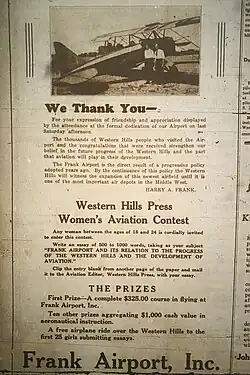 During the airport's early months, a "Women's Aviation Contest" invited women between the ages of 18 and 24 were to write a 500–1000 word essay about Frank Airport and its relationship to aviation development.[36] The winner would win a $325 flying course at the airport.[36] Ten other prizes, totaling $1,000, would be divided as aeronautical instruction.[36] The first 25 women to submit essays would receive a "free airplane ride over the Western Hills".[35][36] The essay judges were: