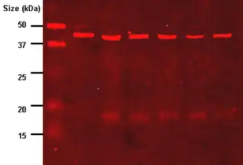30. ^ Gilda JE, Gomes AV (September 2013). "Stain-Free total protein staining is a superior loading control to β-actin for Western blots". Analytical Biochemistry. 440 (2): 186–188. doi:10.1016/j.ab.2013.05.027. PMC 3809032. PMID 23747530.