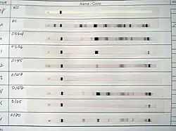Western blot HIV test where the first two strips are negative and positive controls followed by actual tests