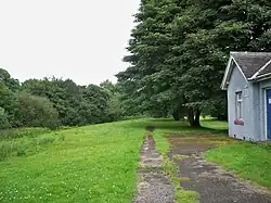 Course of the old railway at Westgate. The building on the right is the former station building, restored as a community centre. The trackbed has been filled in and landscaped - the 'path' in front of the camera is the edge of the old platform.