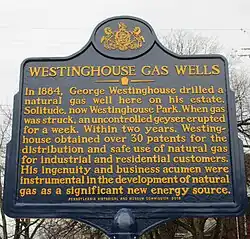 The park land is the former estate of George Westinghouse, an American entrepreneur and engineer, and his wife Marguerite. With an area of about 10 acres, it was the site of his mansion known as Solitude. At this house, Westinghouse worked with his engineers, including Nikola Tesla, and entertained notable people of the day, including scientist William Thomson (Lord Kelvin), and congressman and later president William McKinley.[1] Close by was another building, a carriage house, that housed his private laboratory in the basement. There, he developed some of his residential electric lighting technology, installing a generator and running cables to the main house, with wires that were left exposed on the interior walls, so as not to cut into the woodwork.[2] Also there, Westinghouse invented methods to control and transmit natural gas for both industrial and residential consumers. In the winter of 1883/1884, seeking a source of natural gas in his own "backyard," Westinghouse ordered drilling on his estate. When gas was struck on May 22, 1884, a blowout resulted in the uncontrolled release of gas for about a week. Westinghouse devised a way to cap the well. An illumination test was conducted by igniting the gas jet at the top of a tall pipe. It initially produced a 100-foot flame that illuminated a mile-wide area to a brightness sufficient to read a newspaper.[2] This well was designated as "Westinghouse Well No. 1" or "Old No. 1" to distinguish it from several other wells that were drilled in the area.[3] Eventually, several natural gas derricks towered above the estate's Victorian gardens.[4] In modern times there is no above-ground trace left of these derricks.