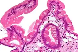 | Low magnification micrograph of Whipple's disease showing the characteristic foamy appearing infiltrate of the lamina propria. Duodenal biopsy. H&E stain. | |